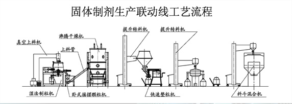 流程说明:初始物料经真空上料机进入湿法制粒机内,加入适量的粘合剂进行充分的混合并制成湿润的软材,把制好的软材直接通过摇摆颗粒机中进行制粒,制好的颗粒通过软管在真空负压的作用下进入沸腾干燥机内进行充分的干燥,干燥后的物料经提升转料机提升到一定高度,并接入整粒机直接进行整粒,整粒后经提升加料机进入旋转振动筛,经振动过筛后得到所需的成品颗粒,成品颗粒经真空上料机进入到料斗混合机内进行批号总混,再经过料桶的转移,进入压片、填充等其他后继工序。