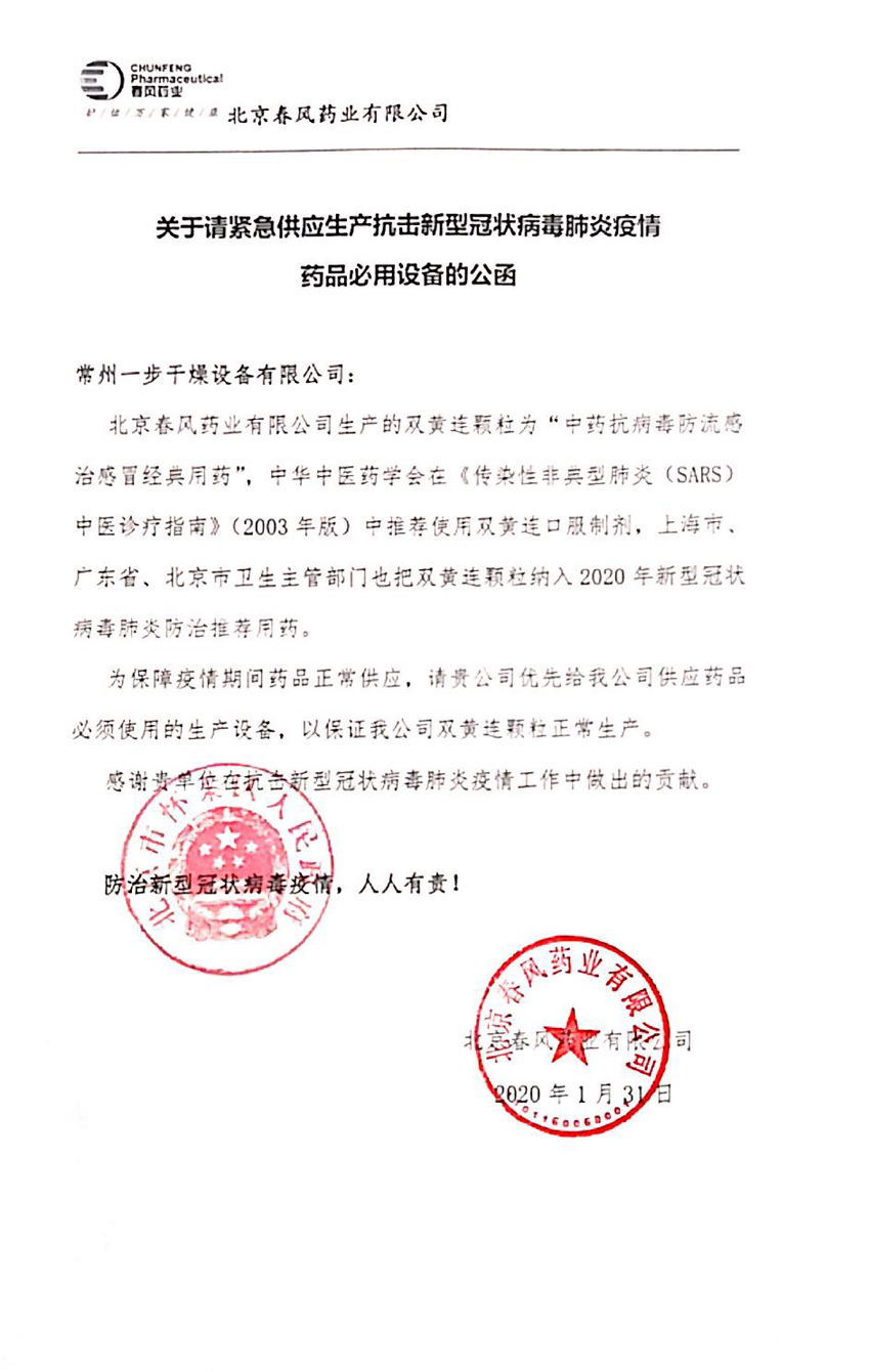 2020年1月31日,北京市怀柔区人民政府盖章发来公函,请紧急供应北京春风药业有限公司急需的抗击新冠状病毒肺炎疫情药品必用设备。春风药业年前选定的一步公司生产的FL-500型一步制粒干燥机提前发货,在车间主任、制粒班组以及抛光,电工、激光落料、线切割、钣金、氩孤焊等相关人员、各工种的配合下,突击到2月2日1点深夜完工发出,直运北京春风药业。为抗击新型冠状病毒一步在行动,这是一步速度、一步精神,在此对本项目的参与人员致敬!