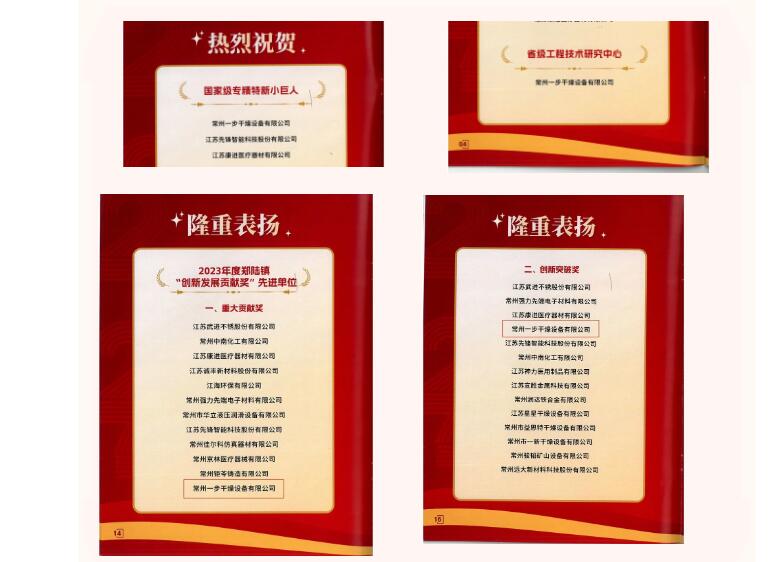 大会宣读了高新区(郑陆镇)2023年获市级以上荣誉的企业和单位名单,表彰了2023年度郑陆镇“创新发展贡献奖”先进单位。常州一步干燥设备有限公司凭借出色的企业创新能力荣登“光荣榜”,被授予2023年度“创新突破奖”、“重大贡献奖”等多项荣誉。