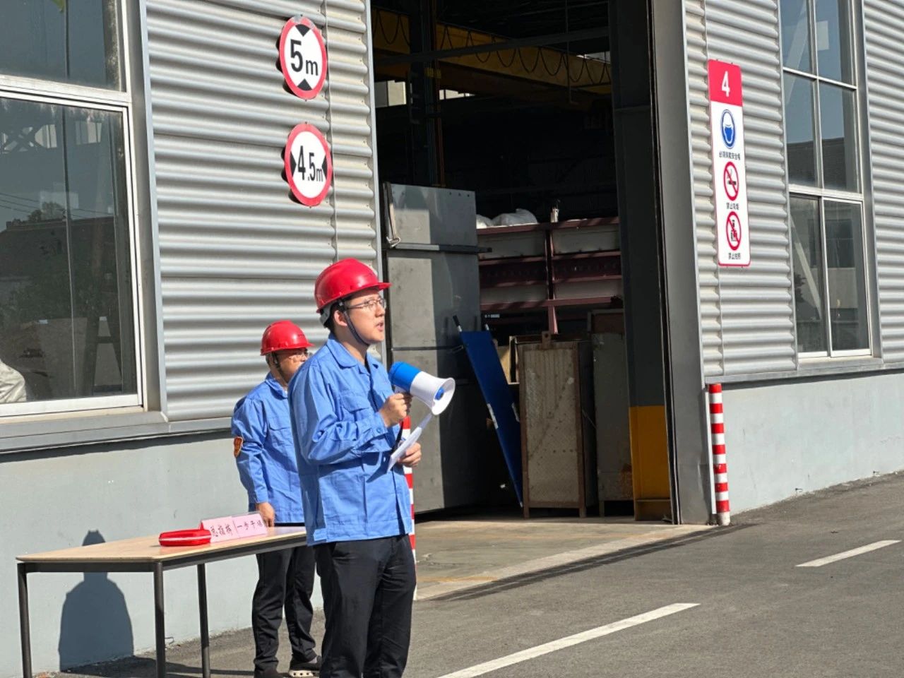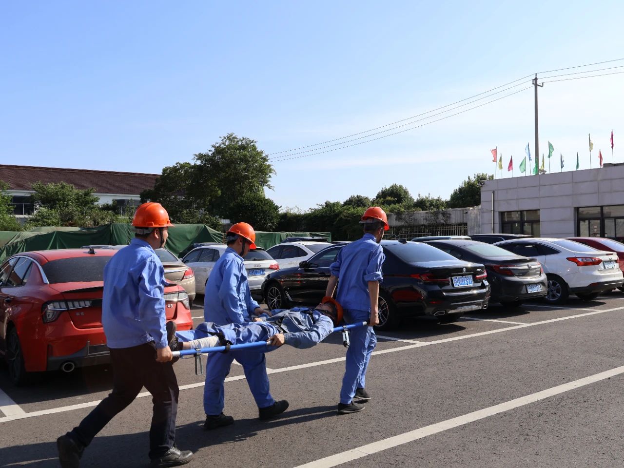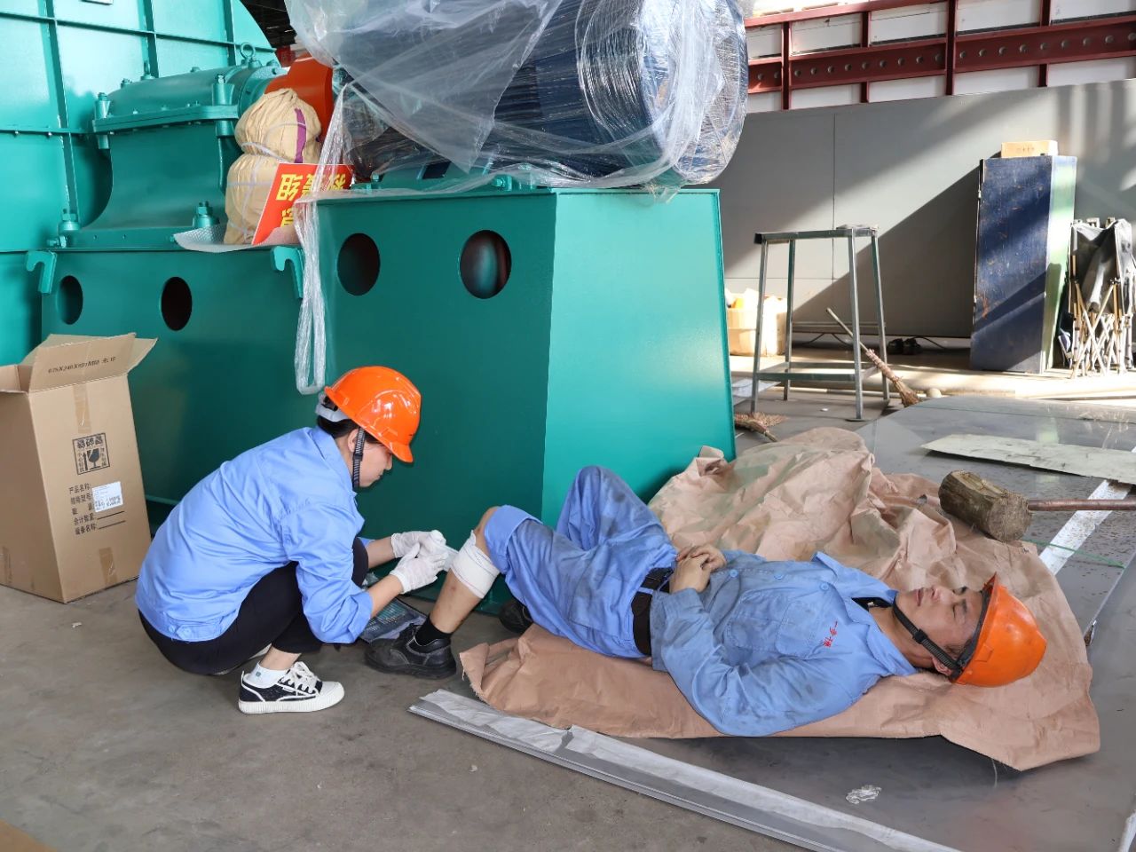 本次演练,主要模拟在车间4号门发货区,一名工人在进行起重机吊装作业时,由于吊带老化突然断裂,货物坠落后砸伤作业人员出现险情。现场管理人员在查看现场伤员情况后,立即汇报应急救援组组长。应急救援组组长启动起重伤害事故应急救援预案,展开救援工作。