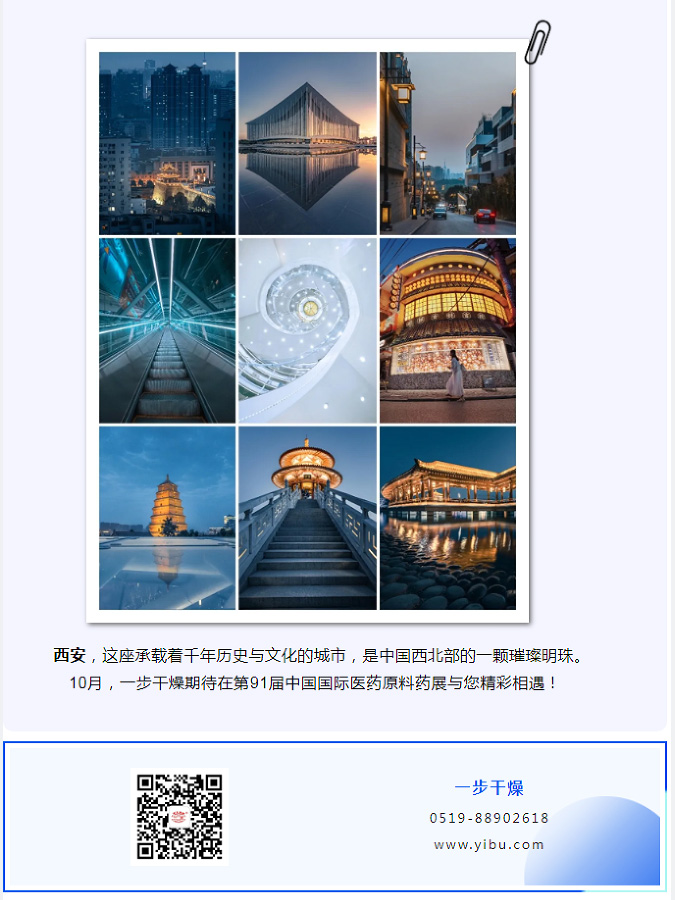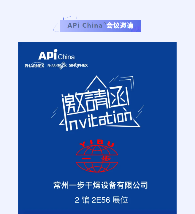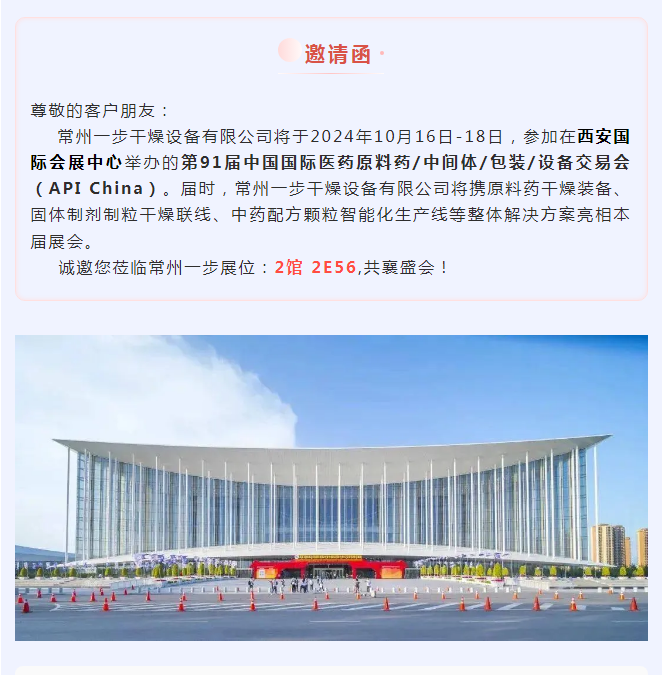 常州一步干燥设备有限公司将于2024年10月16日-18日,参加在西安国际会展中心举办的第91届中国国际医药原料药/中间体/包装/设备交易会(API China)。届时,常州一步干燥设备有限公司将携原料药干燥装备、固体制剂制粒干燥联线、中药配方颗粒智能化生产线等整体解决方案亮相本届展会。