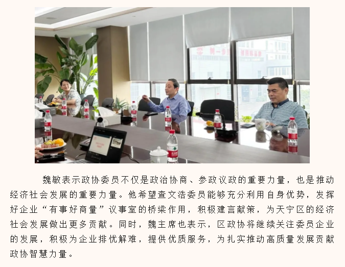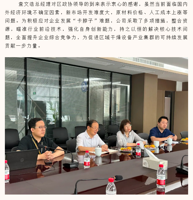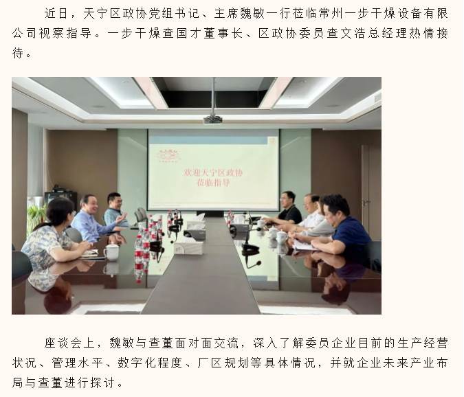 近日,天宁区政协党组书记、主席魏敏一行莅临常州一步干燥设备有限公司视察指导。一步干燥查国才董事长、区政协委员查文浩总经理热情接待。