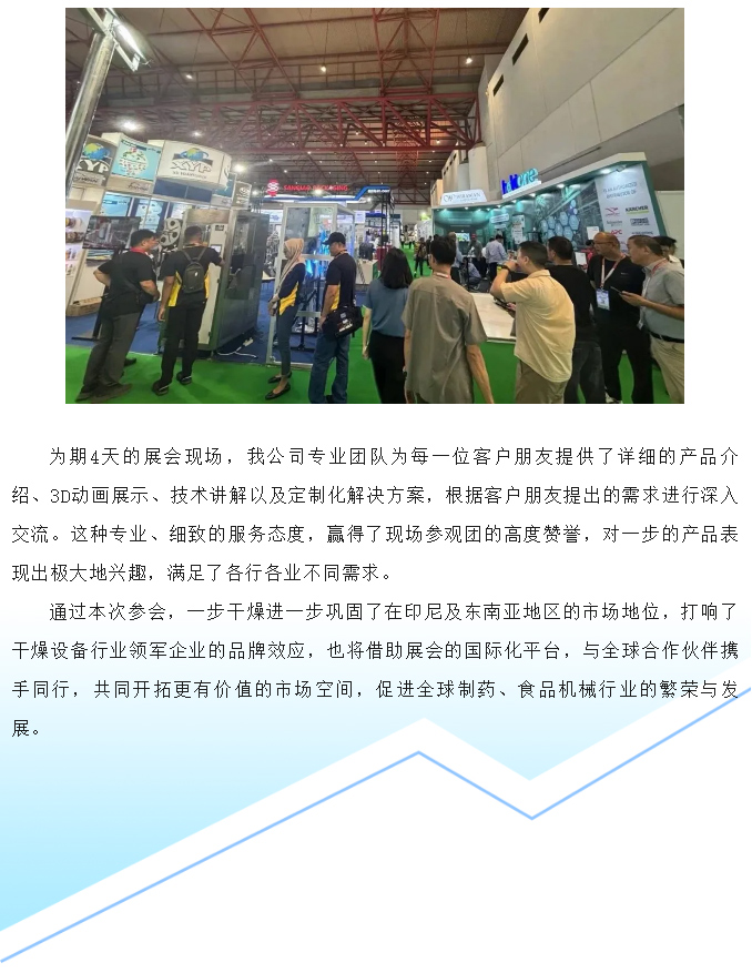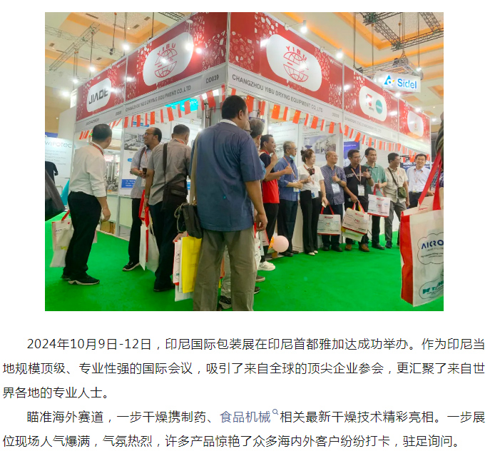 2024年10月9日-12日,印尼国际包装展在印尼首都雅加达成功举办。作为印尼当地规模顶级、专业性强的国际会议,吸引了来自全球的顶尖企业参会,更汇聚了来自世界各地的专业人士。瞄准海外赛道,一步干燥携制药、食品机械相关最新干燥技术精彩亮相。一步展位现场人气爆满,气氛热烈,许多产品惊艳了众多海内外客户纷纷打卡,驻足询问。