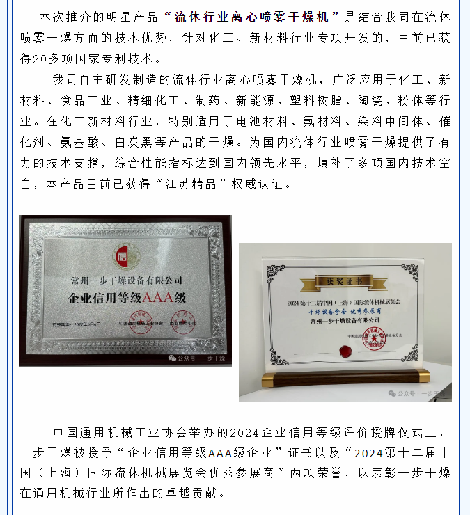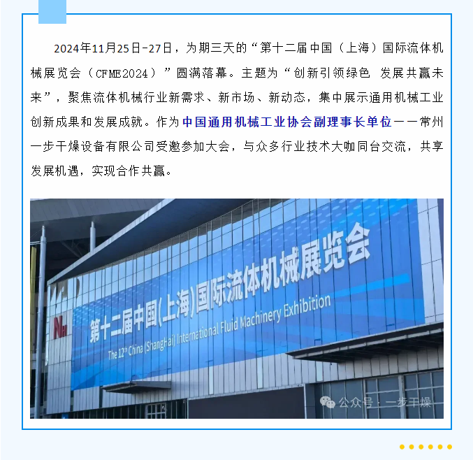 2024年11月25日-27日,为期三天的“第十二届中国(上海)国际流体机械展览会(CFME2024)”圆满落幕。主题为“创新引领绿色 发展共赢未来”,聚焦流体机械行业新需求、新市场、新动态,集中展示通用机械工业创新成果和发展成就。作为中国通用机械工业协会副理事长单位——常州一步干燥设备有限公司受邀参加大会,与众多行业技术大咖同台交流,共享发展机遇,实现合作共赢。