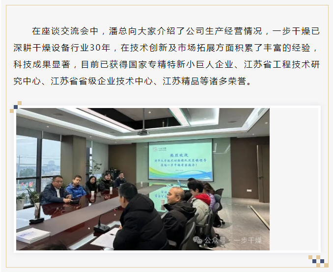 2024年12月25日,清华大学“新能源汽车、高端装备”领域部分优质项目路演活动在常州市天宁区郑陆镇召开。活动当天,清华大学技术成果对接团队走进常州一步干燥设备有限公司考察交流。清华团队在一步干燥生产副总潘文锋的陪同下,参观了公司现代化生产车间,了解到公司生产流程、产品工艺情况,直观的感受到一步雄厚的研发制造实力。