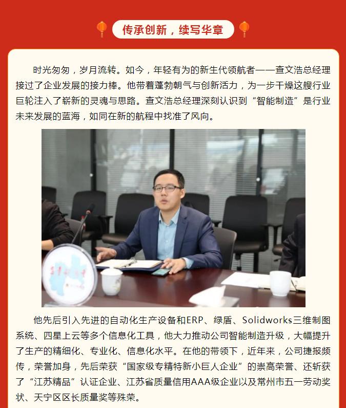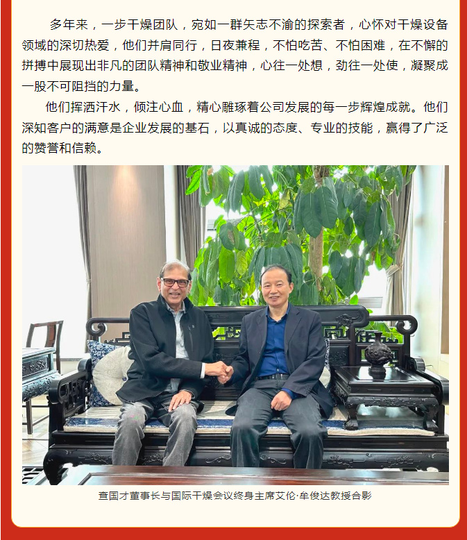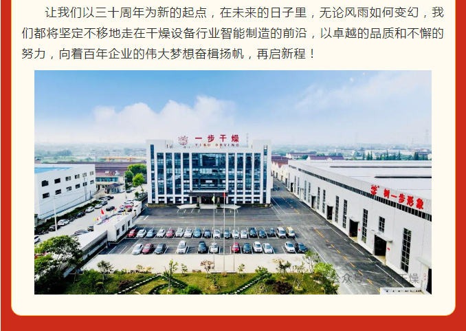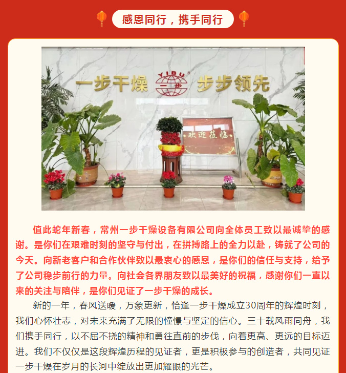 瑞蛇迎春至,伟业启新航。当新年的钟声敲响,时光的指针缓缓指向新的年度,在这新春佳节即将到来之际,常州一步干燥设备有限公司满怀着感恩与豪情,即将迎来公司成立 30 周年。我们回首过去 30 年奋斗的每一个脚印,立足当下已然铸就的辉煌成就,展望未来发展的无限可能,心中满是憧憬与期待,仿佛看到了一步干燥向着百年企业的目标奋勇前行的壮丽画卷。