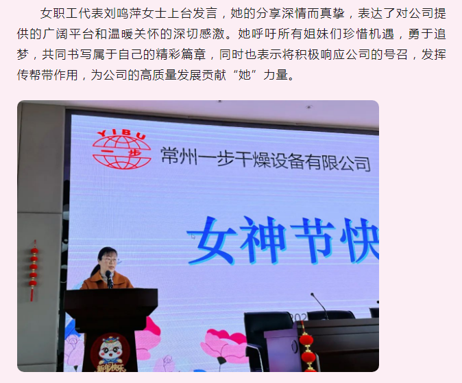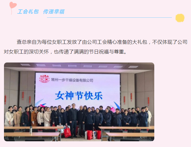 在这个春意盎然、万物复苏的美好时节,我们迎来了第115个国际劳动妇女节。3月8日上午,一步干燥举办了一场温馨而富有意义的妇女节庆祝活动,以“春风如你,熠熠芳华”为主题,向每一位辛勤付出的女职工致以最诚挚的祝福与敬意。