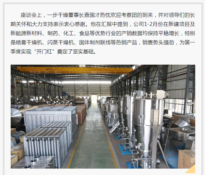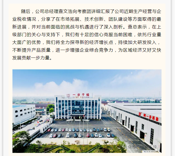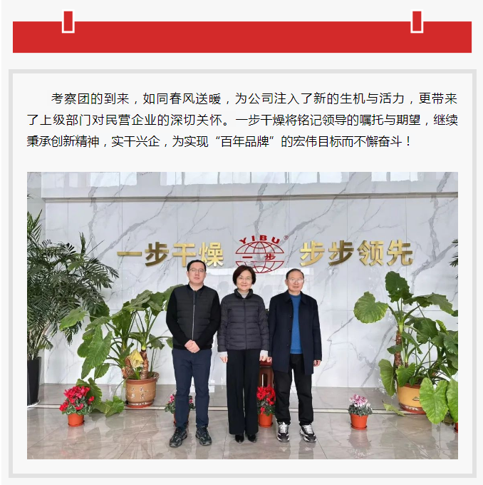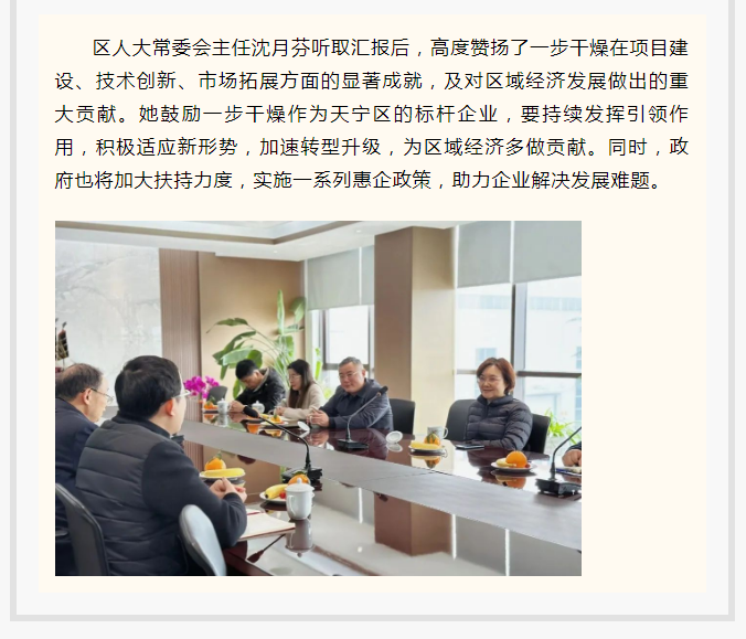 2025年3月7日上午,常州市天宁区人大常委会主任沈月芬率队赴常州一步干燥设备有限公司调研,郑陆镇人大主席黄佳清陪同考察。一步干燥董事长查国才、总经理查文浩热情接待。