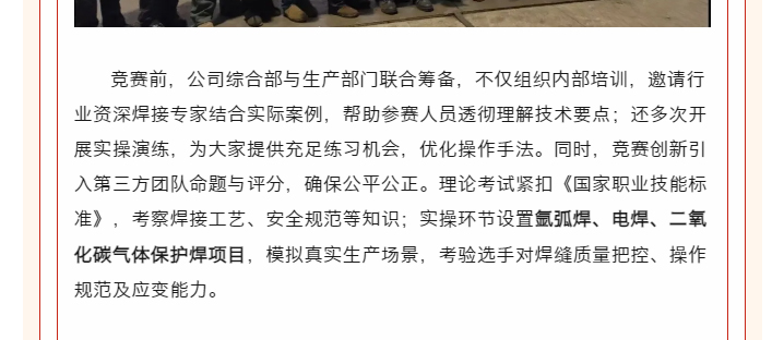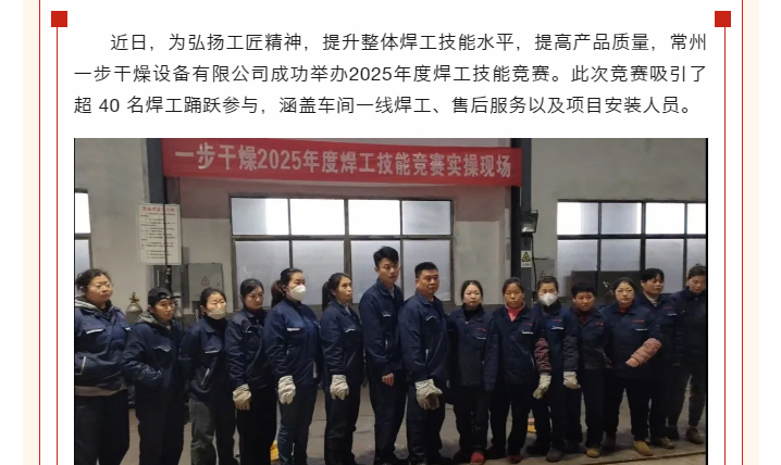 近日,为弘扬工匠精神,提升整体焊工技能水平,提高产品质量,常州一步干燥设备有限公司成功举办2025年度焊工技能竞赛。此次竞赛吸引了超 40 名焊工踊跃参与,涵盖车间一线焊工、售后服务以及项目安装人员。