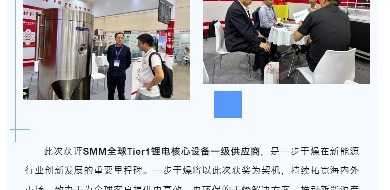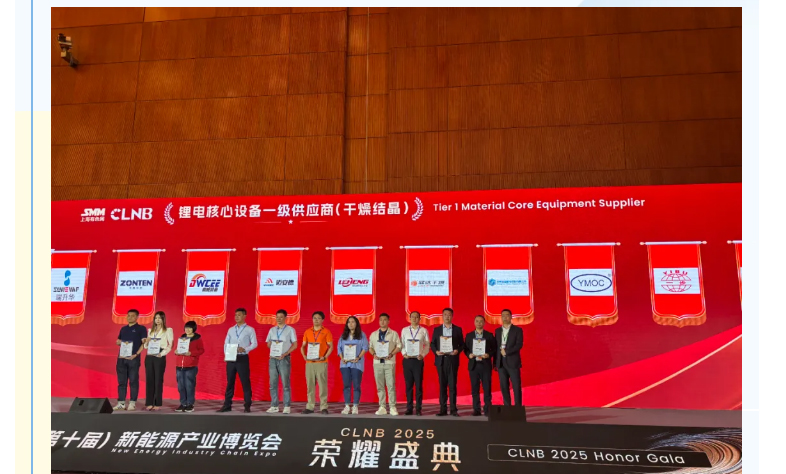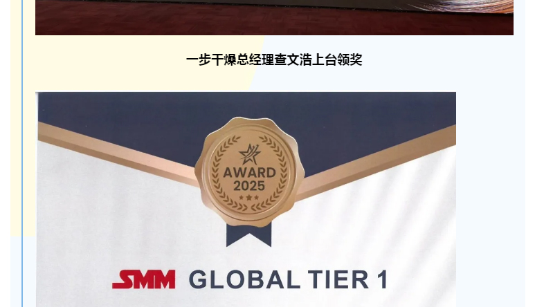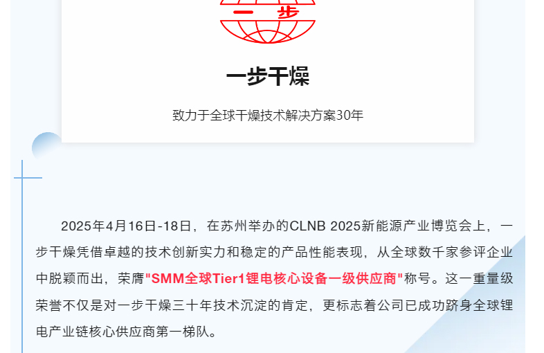 2025年4月16日-18日,在苏州举办的CLNB 2025新能源产业博览会上,一步干燥凭借卓越的技术创新实力和稳定的产品性能表现,从全球数千家参评企业中脱颖而出,荣膺"SMM全球Tier1锂电核心设备一级供应商"称号。这一重量级荣誉不仅是对一步干燥三十年技术沉淀的肯定,更标志着公司已成功跻身全球锂电产业链核心供应商第一梯队。