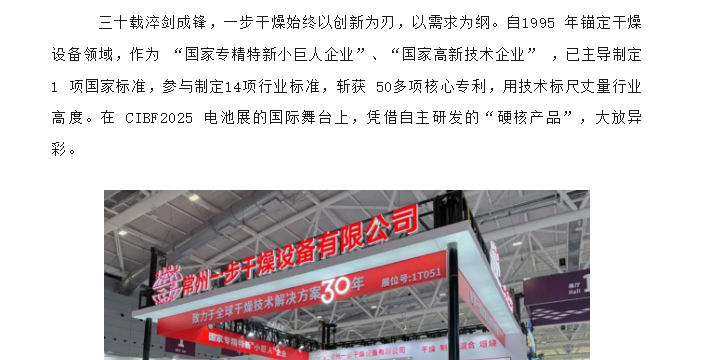 2025 年5月15日-17日,被誉为全球电池行业 "风向标" 的 CIBF 电池展在深圳国际会展中心盛大启幕。常州一步干燥设备有限公司以 30 年深耕行业的技术底蕴与创新实力惊艳亮相1号馆1T051展位,凭借硬核产品与专业服务,在这场国际盛会上实力圈粉。