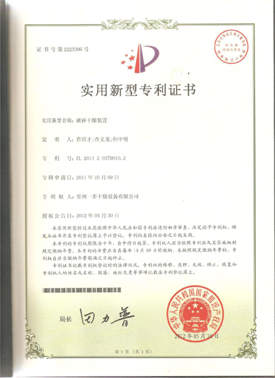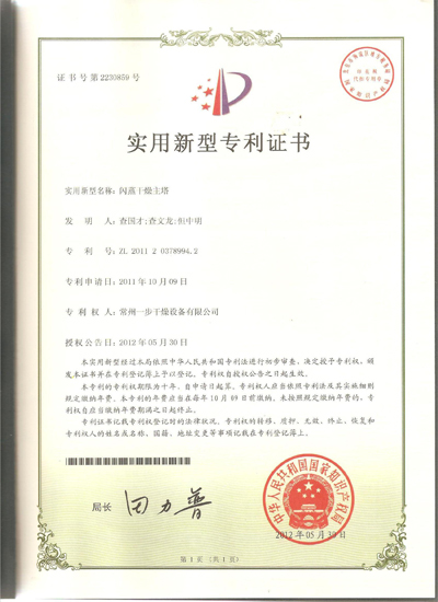 公司申报的“闪蒸干燥主塔和破碎干燥装置”通过国家知识产权局的审核,并取得实用新型专利证书,闪蒸干燥主塔专利号是:ZL2011-2-0378994.2,破碎干燥装置专利号是:ZL2011-2-0379010.2,下图为专利证书的扫描件。