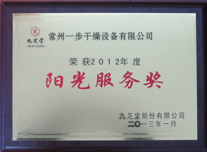 常州一步作为仅有的一家干燥设备生产商受邀参加2012年九芝堂股份有限公司供应商大会并荣获“阳光服务奖”,此殊荣的获得是九芝堂公司对我公司产品质量、售后服务的充分肯定。2012年,公司高度重视客户服务工作,以“科学管理、精心制作、诚挚服务、顾客满意”为企业宗旨,做好售前、售中、售后服务,顾客满意率达98%以上,客户愿意与我公司继续合作。
