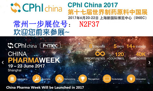 CPHI China 2017世界制药原料中国展将于2017年6月20-22日,在上海新国际博览中心隆重召开。感谢新老客户多年来对常州一步的支持,一步展位号是:N2F37,欢迎各位前来参观洽谈合作。