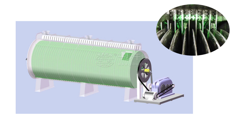 圆盘式干燥机主体由一个圆筒形的外壳和一组中心贯穿的圆盘组成。圆盘组是中空的,热介质从这里流过,把热量通过圆盘间接传输给物料。物料在圆盘与外壳之间通过,接受圆盘传递的热,蒸发水份,物料水份蒸发形成的水蒸气,被热风带出干燥机。